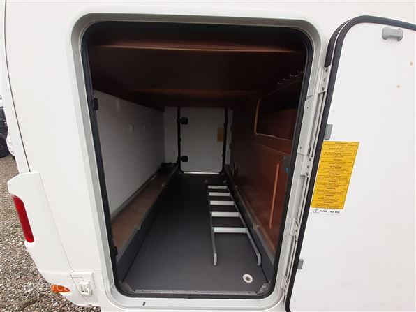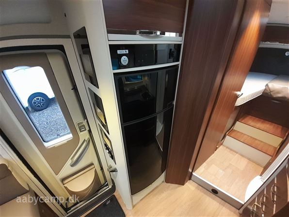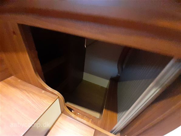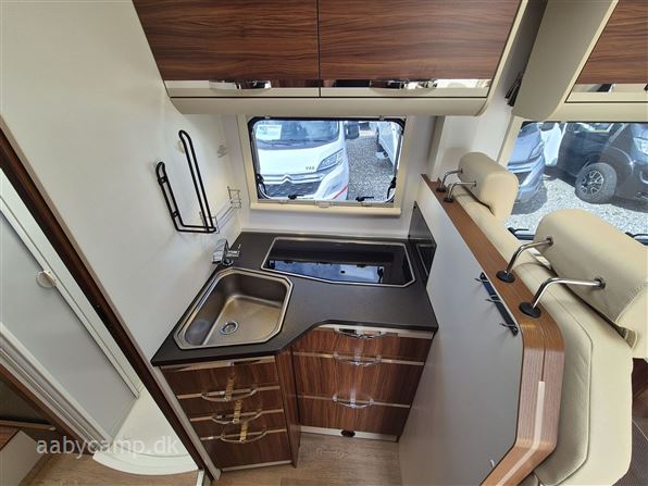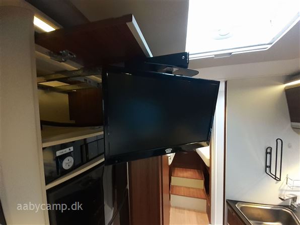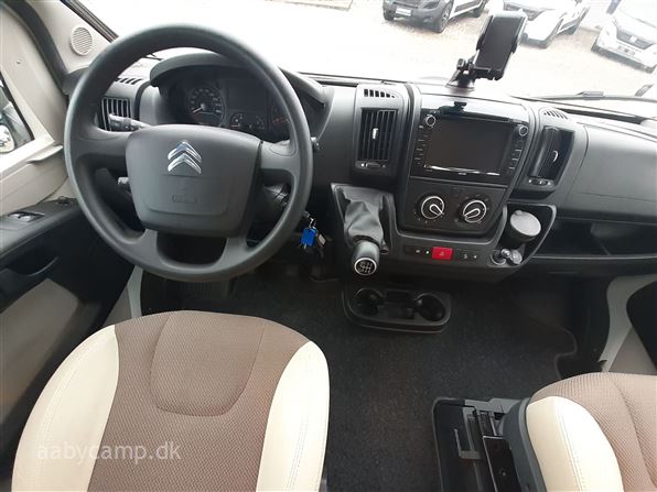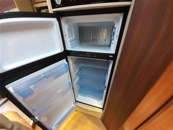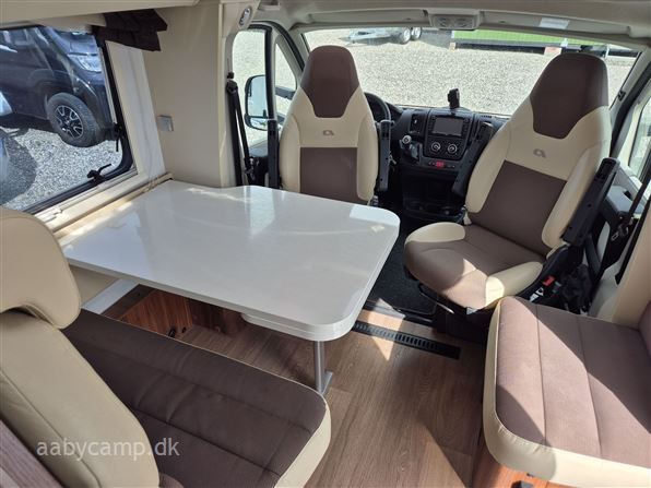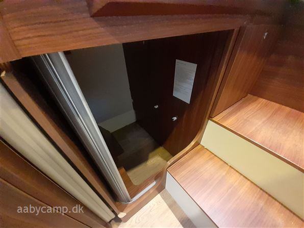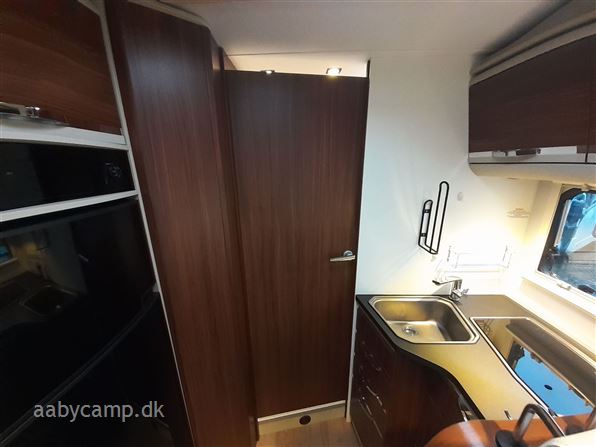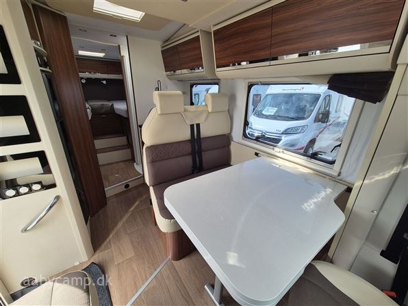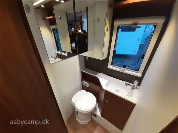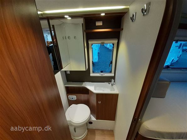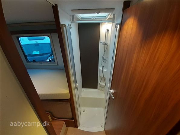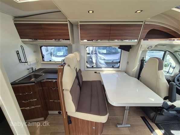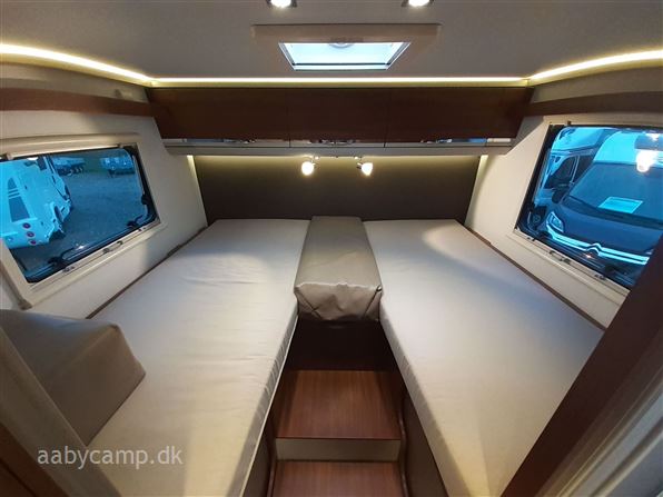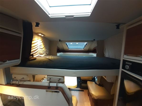 en pæn og velkørende camper med en god indretning bemærk at den har 5 selepladser. idrettet med en fin siddegruppe med lædersæder over den er der en sænkeseng. køkken med tre gasblus og stort højt monteret køleskab med fryser og fint med skab og skuffeplads. toilet og bad på hvet sin side i to gode rum. to enkelt senge i bagenden derkan laves om til en stor seng med opbevaringsplads nedenunder. derudover er der en rummelig garage på denne model.