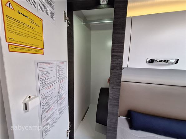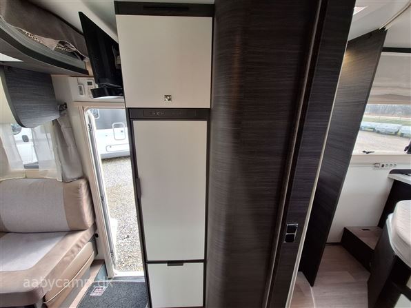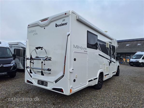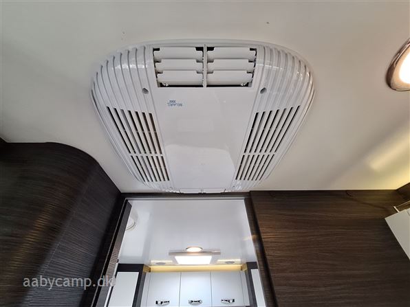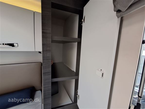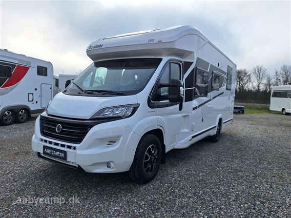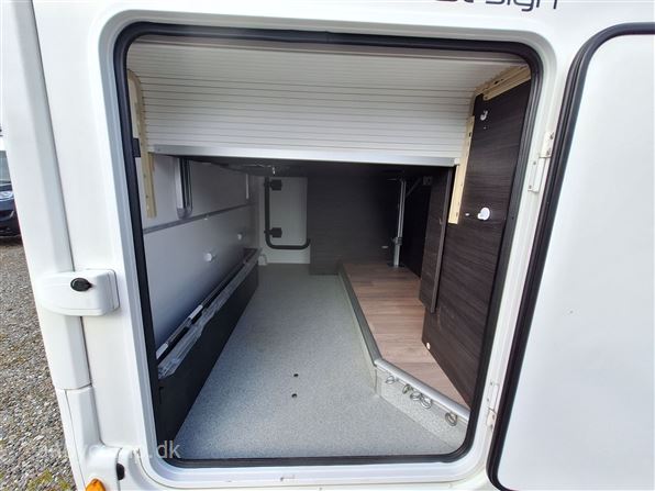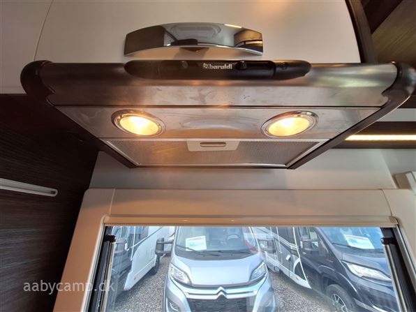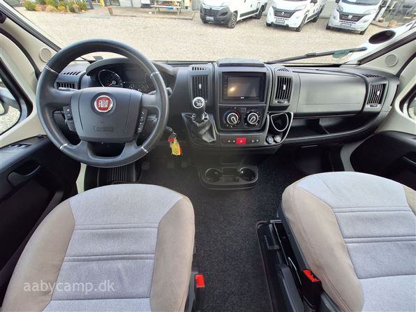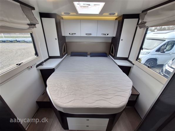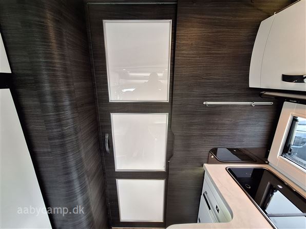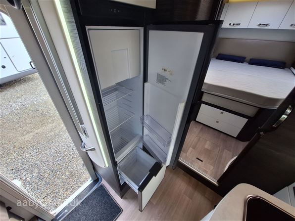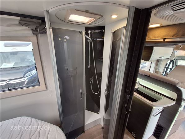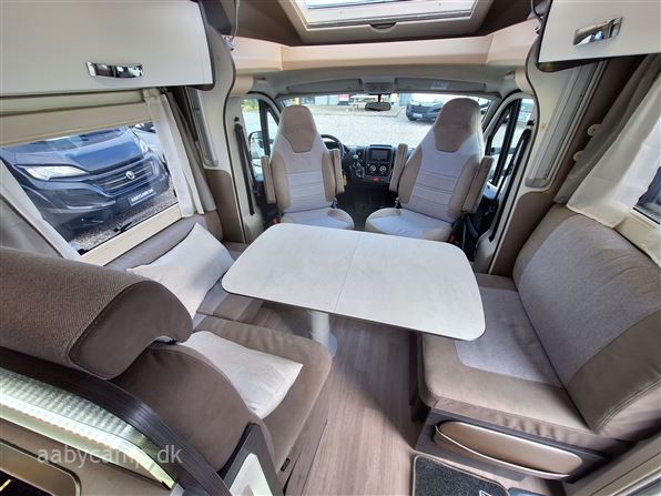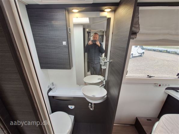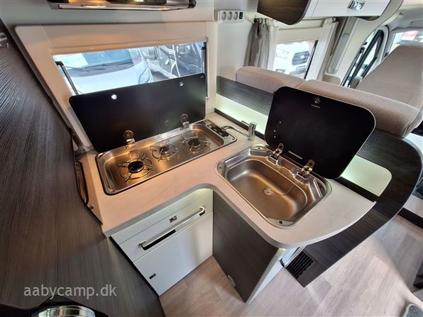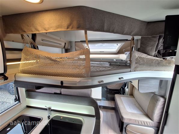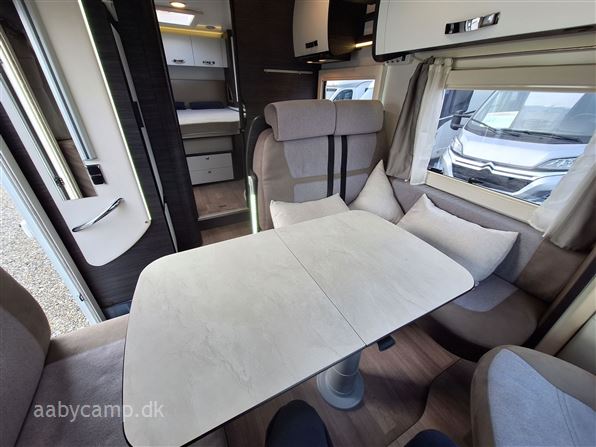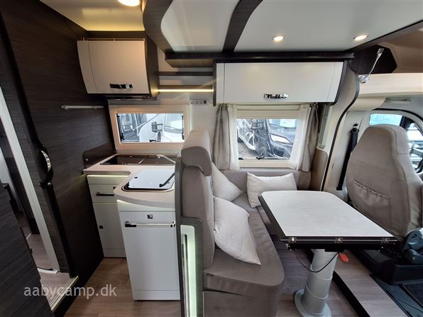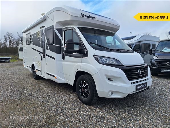 Rigtig pæn og veludstyret camper fra populære Benimar. indrettet med med dejlig siddegruppe og over den en sænkeseng. køkken med tre gasblus og stort køleskab med fryser og skab og skuffeplads. toilet og bad på hvert sin side i to gode rum. queensbed der kan justeres i højeden alt efter hvor meget garageplads du skal bruge.