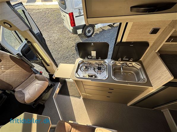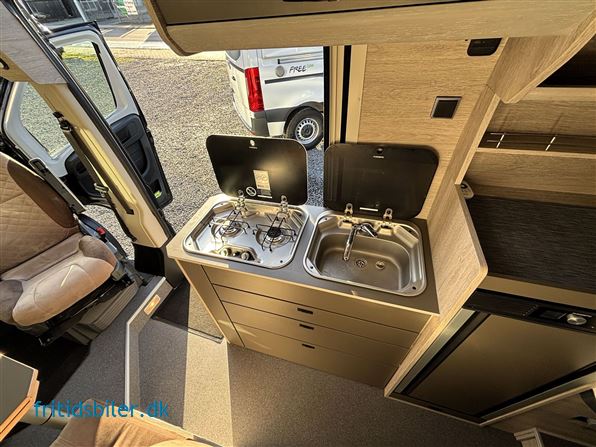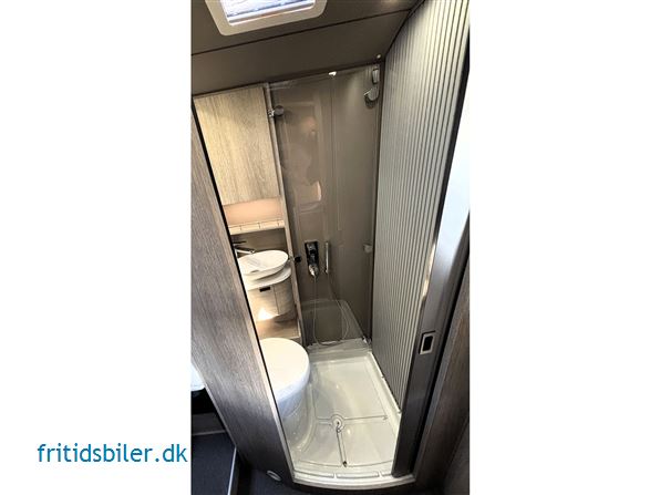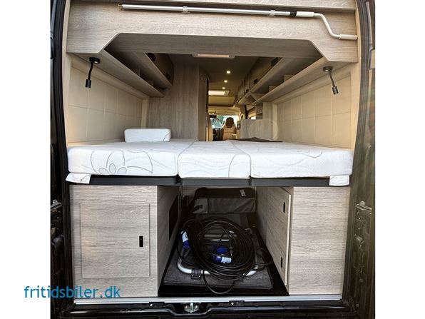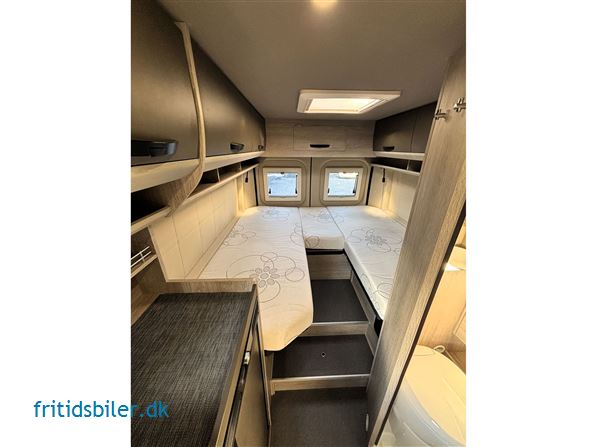 Denne luksuriøse camper er udstyret med automatgear, elegant Nova-interiør og Graphite-tekstiler, som tilsammen skaber en moderne og hyggelig atmosfære. Indretningen byder på langs gående enkeltsenge med trappe imellem, et stort badeværelse med separat brusekabine og toilet – alt i et stilrent og funktionelt design.