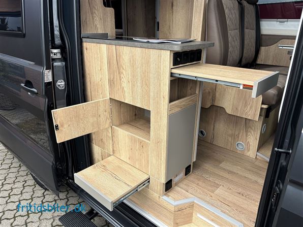 Indvendigt byder camperen på flot design med sans for detaljen – fra lækre materialer til en gennemtænkt indretning, hvor funktionalitet og æstetik går hånd i hånd. Uanset om du befinder dig på en øde strand, i bjergene eller i skoven, er Mega Mobil din mobile base med alt, du har brug for.