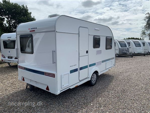 Fin og let vogn. Dobbeltseng, siddegruppe, køkken og toiletrum.