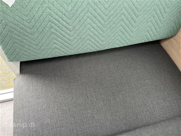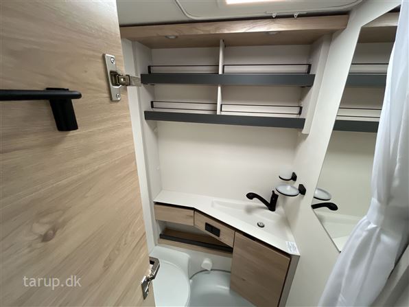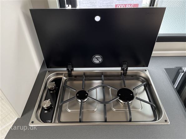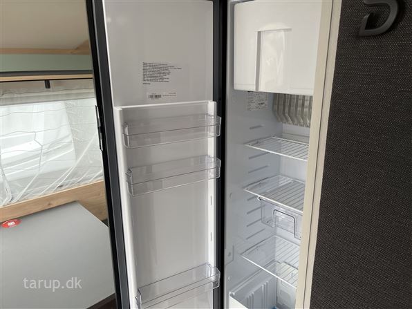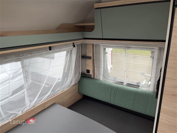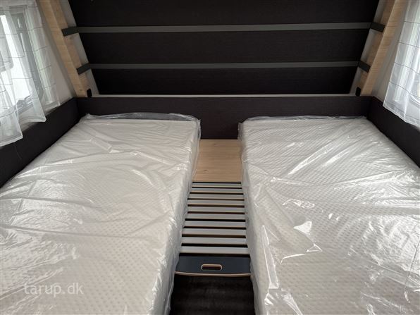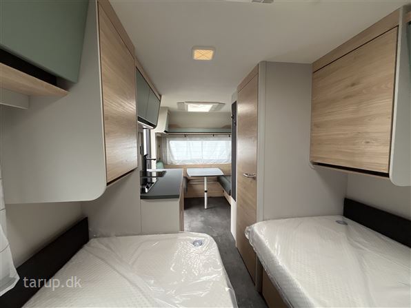 Enkeltsenge, ende-sidde-gruppe, NYHED... nu med 2 gasblus, 3-trins el-gulv-varme, 137 l. køleskab med fryser, 17" alufælge, 1700 kg. aksel, indgangsdør med vindue, mobil spildevandstank, lameludtræk til dobbeltseng. Denne vogn er bestilt med betrækket "Downtown".