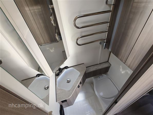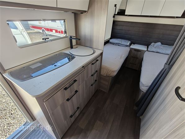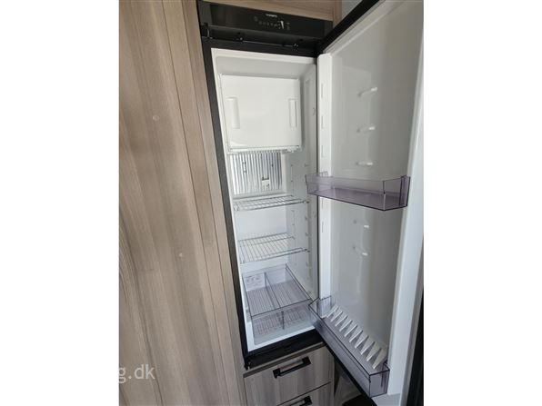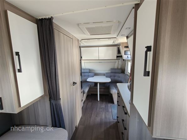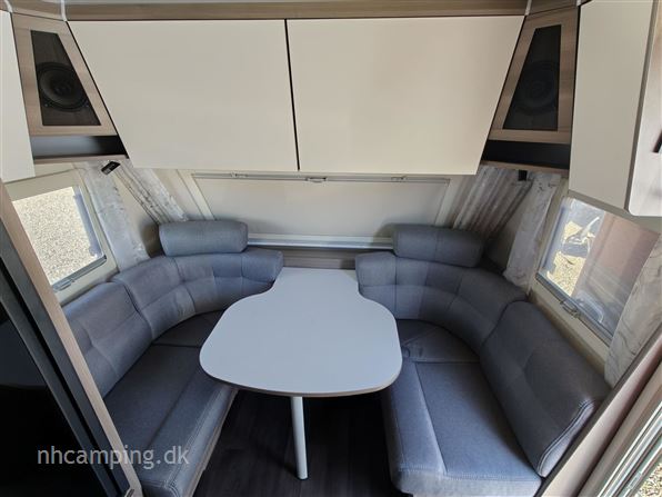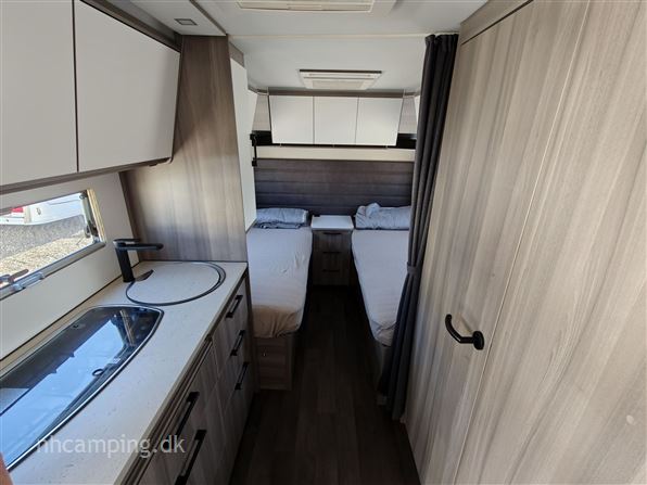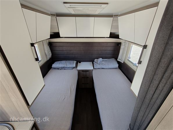 Lille Smal vogn, Perfekt til elbil, med enkeltsenge og ALDE centralvarme, vandbåren gulvvarme, køleskab incl. fryser, alufælge, endesiddegruppe, stabilisator, batteri, tv-antenne, radio, højttalere foran. Denne vogn er bestilt med designpakke og komfortpakke! Designpakken indeholder: Alufælge, HEKI II tagluge, dør med vindue og træktøjsafdækning! Komfortpakken indeholder: Nakkepuder, serviceklap og håndklædetørrer. Hyndestof "Austn" i lys grå stof i siddegruppe. Sælges med 1 års Garanti